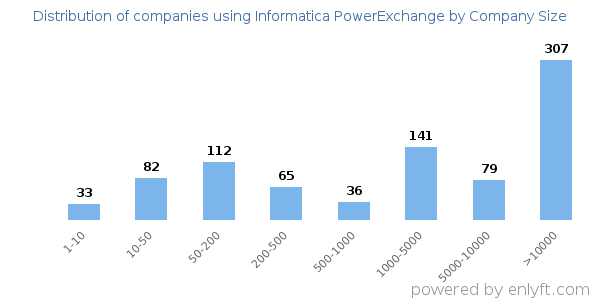 Of all the customers that are using Informatica PowerExchange, a majority (60%) are large (>1000 employees), 14% are small (<50 employees) and 25% are medium-sized.