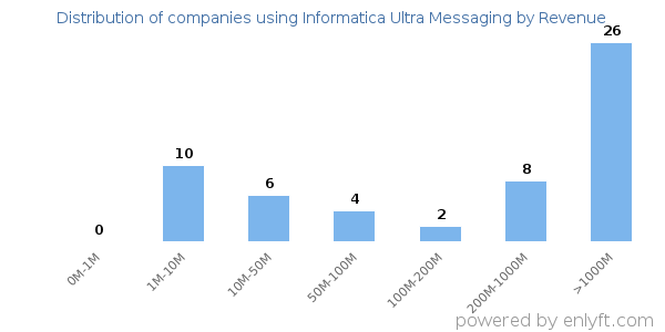Of all the customers that are using Informatica Ultra Messaging, a majority (56%) are large (>$1000M), 25% are small (<$50M) and 6% are medium-sized.