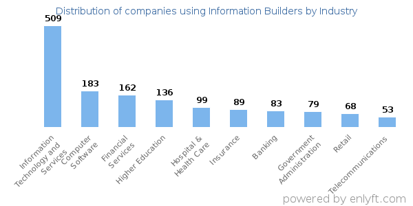We have data on 2,487 companies that use Information Builders. The companies using Information Builders are most often found in United States and in the Information Technology and Services industry. Information Builders is most often used by companies with >10000 employees and >1000M dollars in revenue. Our data for Information Builders usage goes back as far as 9 years and 10 months.