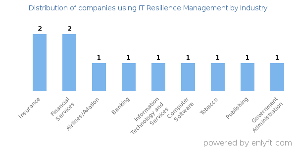 We have data on 11 companies that use IT Resilience Management. The companies using IT Resilience Management are most often found in United States and in the Insurance industry. IT Resilience Management is most often used by companies with >10000 employees and >1000M dollars in revenue. Our data for IT Resilience Management usage goes back as far as 8 years and 2 months.