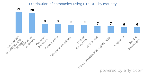 Looking at ITESOFT customers by industry, we find that Information Technology and Services (10%) and Computer Software (9%) are the largest segments.