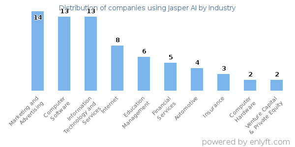 Looking at Jasper AI customers by industry, we find that Marketing and Advertising (13%), Computer Software (12%), Information Technology and Services (12%), Internet (7%) and Education Management (5%) are the largest segments.