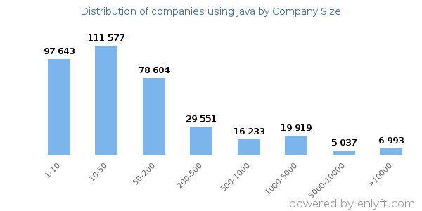 We have data on 418,367 companies that use Java. The companies using Java are most often found in United States and in the Information Technology and Services industry. Java is most often used by companies with 10-50 employees and 1M-10M dollars in revenue. Our data for Java usage goes back as far as 10 years and 1 months.