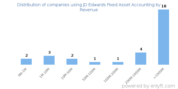 We have data on 31 companies that use JD Edwards Fixed Asset Accounting. The companies using JD Edwards Fixed Asset Accounting are most often found in United States and in the Computer Software industry. JD Edwards Fixed Asset Accounting is most often used by companies with >10000 employees and >1000M dollars in revenue. Our data for JD Edwards Fixed Asset Accounting usage goes back as far as 9 years and 4 months.