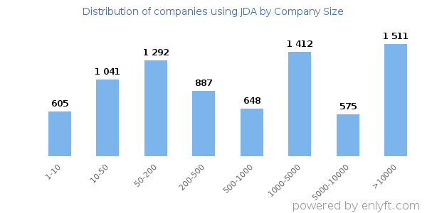 We have data on 8,219 companies that use JDA. The companies using JDA are most often found in United States and in the Information Technology and Services industry. JDA is most often used by companies with >10000 employees and >1000M dollars in revenue. Our data for JDA usage goes back as far as 9 years and 11 months.