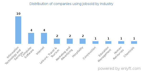 Looking at Jobsoid customers by industry, we find that Information Technology and Services (22%), Computer Software (8%) and Internet (8%) are the largest segments.