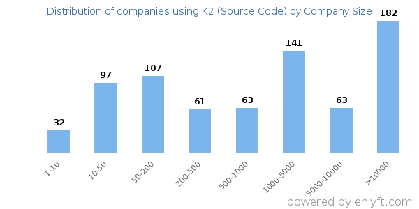 We have data on 756 companies that use K2 (Source Code). The companies using K2 (Source Code) are most often found in United States and in the Information Technology and Services industry. K2 (Source Code) is most often used by companies with >10000 employees and >1000M dollars in revenue. Our data for K2 (Source Code) usage goes back as far as 8 years and 5 months.