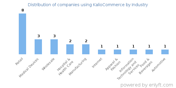 Looking at KalioCommerce customers by industry, we find that Retail (25%), Medical Devices (8%) and Wholesale (8%) are the largest segments.