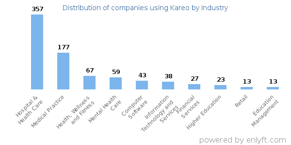 Looking at Kareo customers by industry, we find that Hospital & Health Care (34%), Medical Practice (17%), Health, Wellness and Fitness (6%) and Mental Health Care (5%) are the largest segments.