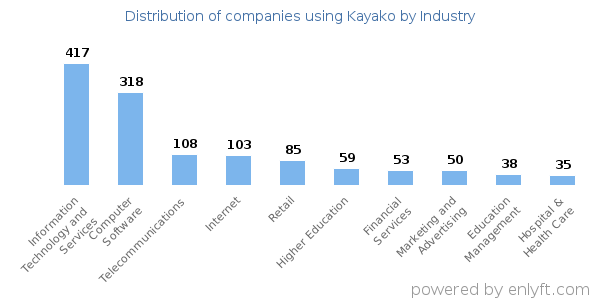 We have data on 2,233 companies that use Kayako. The companies using Kayako are most often found in United States and in the Information Technology and Services industry. Kayako is most often used by companies with 10-50 employees and 1M-10M dollars in revenue. Our data for Kayako usage goes back as far as 10 years and 1 months.