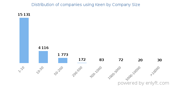 We have data on 22,398 companies that use Keen. The companies using Keen are most often found in United States and in the Insurance industry. Keen is most often used by companies with 1-10 employees and 10M-50M dollars in revenue. Our data for Keen usage goes back as far as 4 years.