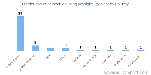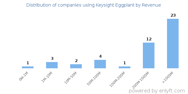 We have data on 46 companies that use Keysight Eggplant. The companies using Keysight Eggplant are most often found in United States and in the Information Technology and Services industry. Keysight Eggplant is most often used by companies with >10000 employees and >1000M dollars in revenue. Our data for Keysight Eggplant usage goes back as far as 2 years and 2 months.
