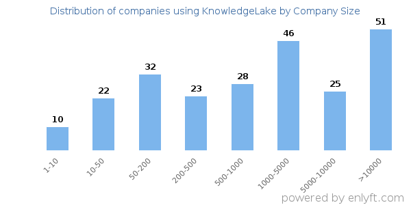 We have data on 239 companies that use KnowledgeLake. The companies using KnowledgeLake are most often found in United States and in the Information Technology and Services industry. KnowledgeLake is most often used by companies with >10000 employees and >1000M dollars in revenue. Our data for KnowledgeLake usage goes back as far as 9 years and 9 months.