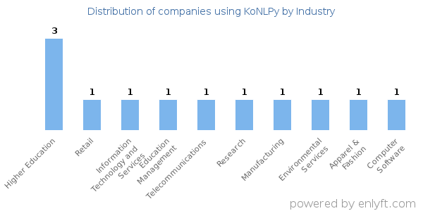 We have data on 15 companies that use KoNLPy. The companies using KoNLPy are most often found in Korea, Republic of and in the Higher Education industry. KoNLPy is most often used by companies with 5000-10000 employees and 10M-50M dollars in revenue. Our data for KoNLPy usage goes back as far as 8 years and 4 months.