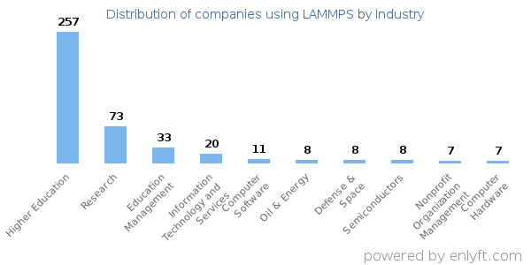 We have data on 537 companies that use LAMMPS. The companies using LAMMPS are most often found in United States and in the Higher Education industry. LAMMPS is most often used by companies with >10000 employees and 200M-1000M dollars in revenue. Our data for LAMMPS usage goes back as far as 4 years and 5 months.