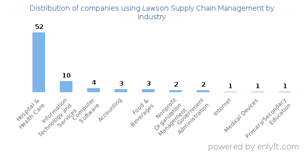 We have data on 94 companies that use Lawson Supply Chain Management. The companies using Lawson Supply Chain Management are most often found in United States and in the Hospital & Health Care industry. Lawson Supply Chain Management is most often used by companies with >10000 employees and >1000M dollars in revenue. Our data for Lawson Supply Chain Management usage goes back as far as 9 years and 7 months.