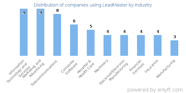 Looking at LeadMaster customers by industry, we find that Information Technology and Services (8%), Marketing and Advertising (8%), Telecommunications (7%) and Computer Software (5%) are the largest segments.