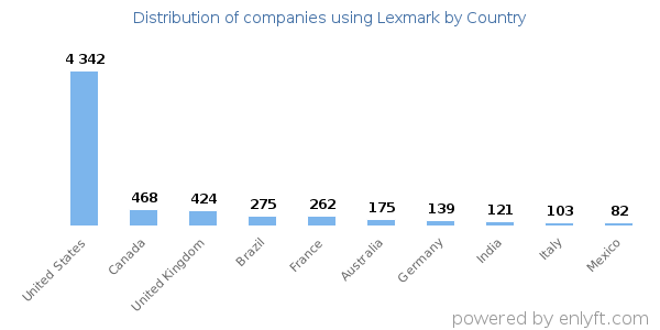 We have data on 7,645 companies that use Lexmark. The companies using Lexmark are most often found in United States and in the Information Technology and Services industry. Lexmark is most often used by companies with 50-200 employees and 1M-10M dollars in revenue. Our data for Lexmark usage goes back as far as 10 years and 2 months.