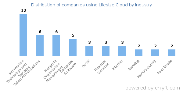 Looking at Lifesize Cloud customers by industry, we find that Information Technology and Services (14%), Telecommunications (7%), Nonprofit Organization Management (7%) and Computer Software (5%) are the largest segments.