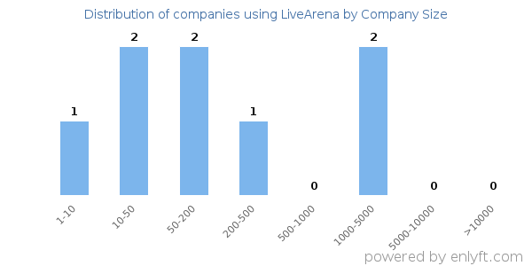 We have data on 9 companies that use LiveArena. The companies using LiveArena are most often found in United States and in the Entertainment industry. LiveArena is most often used by companies with 10-50 employees and 10M-50M dollars in revenue. Our data for LiveArena usage goes back as far as 8 years and 6 months.