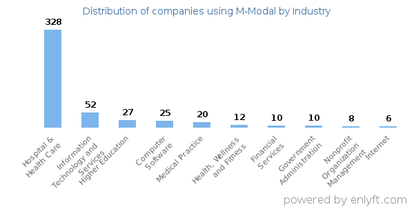 We have data on 619 companies that use M-Modal. The companies using M-Modal are most often found in United States and in the Hospital & Health Care industry. M-Modal is most often used by companies with >10000 employees and >1000M dollars in revenue. Our data for M-Modal usage goes back as far as 8 years and 5 months.