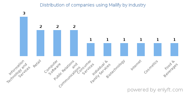 Looking at Mailify customers by industry, we find that Information Technology and Services (9%) is the largest segment.