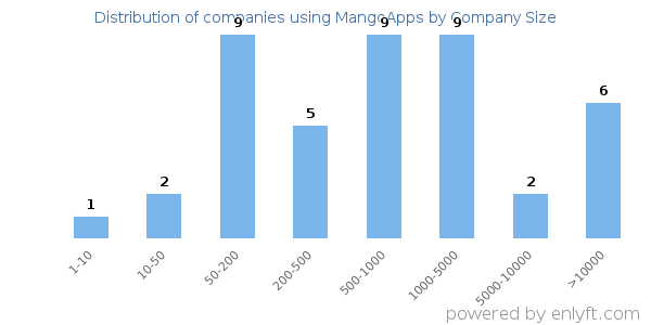 Of all the customers that are using MangoApps, 3% are small (<50 employees), 45% are medium-sized and 33% are large (>1000 employees).