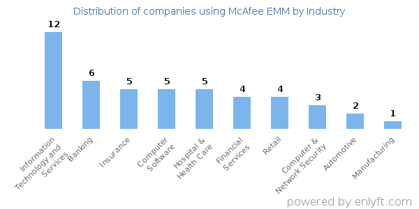 We have data on 69 companies that use McAfee EMM. The companies using McAfee EMM are most often found in United States and in the Information Technology and Services industry. McAfee EMM is most often used by companies with >10000 employees and >1000M dollars in revenue. Our data for McAfee EMM usage goes back as far as 10 years and 1 months.