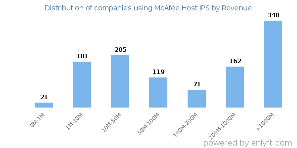 We have data on 1,135 companies that use McAfee Host IPS. The companies using McAfee Host IPS are most often found in United States and in the Information Technology and Services industry. McAfee Host IPS is most often used by companies with >10000 employees and >1000M dollars in revenue. Our data for McAfee Host IPS usage goes back as far as 10 years and 3 months.