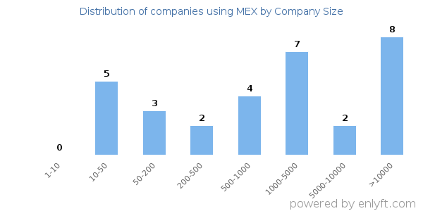Of all the customers that are using MEX, 13% are small (<50 employees), 21% are medium-sized and 47% are large (>1000 employees).