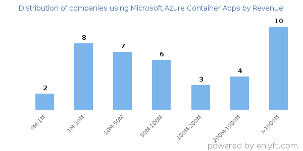 We have data on 41 companies that use Microsoft Azure Container Apps. The companies using Microsoft Azure Container Apps are most often found in United States and in the Information Technology and Services industry. Microsoft Azure Container Apps is most often used by companies with >10000 employees and >1000M dollars in revenue. Our data for Microsoft Azure Container Apps usage goes back as far as 1 years and 9 months.
