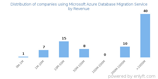 We have data on 88 companies that use Microsoft Azure Database Migration Service. The companies using Microsoft Azure Database Migration Service are most often found in United States and in the Information Technology and Services industry. Microsoft Azure Database Migration Service is most often used by companies with >10000 employees and >1000M dollars in revenue. Our data for Microsoft Azure Database Migration Service usage goes back as far as 2 years and 8 months.