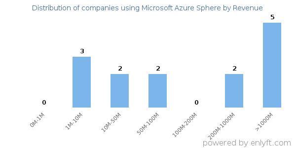 We have data on 14 companies that use Microsoft Azure Sphere. The companies using Microsoft Azure Sphere are most often found in United States and in the Information Technology and Services industry. Microsoft Azure Sphere is most often used by companies with >10000 employees and >1000M dollars in revenue. Our data for Microsoft Azure Sphere usage goes back as far as 1 years and 9 months.