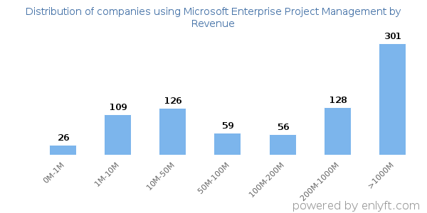 We have data on 844 companies that use Microsoft Enterprise Project Management. The companies using Microsoft Enterprise Project Management are most often found in United States and in the Information Technology and Services industry. Microsoft Enterprise Project Management is most often used by companies with >10000 employees and >1000M dollars in revenue. Our data for Microsoft Enterprise Project Management usage goes back as far as 10 years and 1 months.