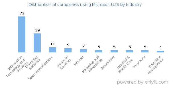 We have data on 228 companies that use Microsoft LUIS. The companies using Microsoft LUIS are most often found in United States and in the Information Technology and Services industry. Microsoft LUIS is most often used by companies with >10000 employees and >1000M dollars in revenue. Our data for Microsoft LUIS usage goes back as far as 2 years and 2 months.