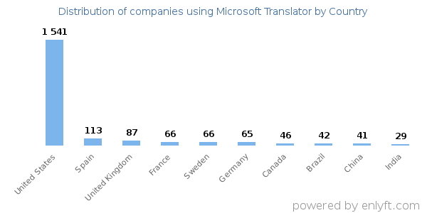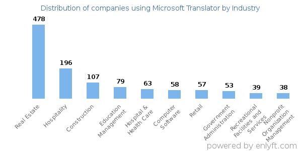 We have data on 2,654 companies that use Microsoft Translator. The companies using Microsoft Translator are most often found in United States and in the Real Estate industry. Microsoft Translator is most often used by companies with 1-10 employees and 1M-10M dollars in revenue. Our data for Microsoft Translator usage goes back as far as 5 years and 2 months.