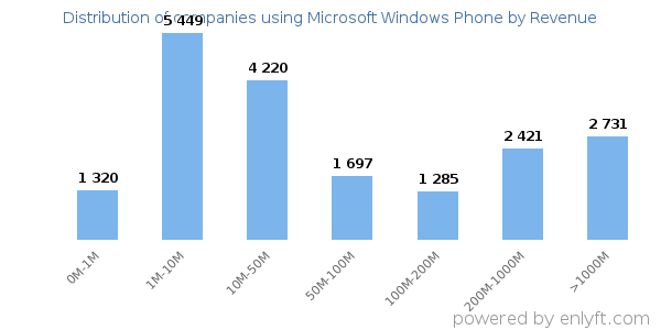 We have data on 20,411 companies that use Microsoft Windows Phone. The companies using Microsoft Windows Phone are most often found in United States and in the Information Technology and Services industry. Microsoft Windows Phone is most often used by companies with 10-50 employees and 1M-10M dollars in revenue. Our data for Microsoft Windows Phone usage goes back as far as 10 years and 2 months.
