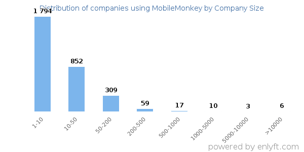 We have data on 3,601 companies that use MobileMonkey. The companies using MobileMonkey are most often found in United States and in the Marketing and Advertising industry. MobileMonkey is most often used by companies with 1-10 employees and 1M-10M dollars in revenue. Our data for MobileMonkey usage goes back as far as 5 years and 2 months.