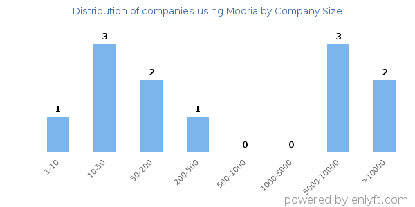 We have data on 12 companies that use Modria. The companies using Modria are most often found in United States and in the Higher Education industry. Modria is most often used by companies with 10-50 employees and 1M-10M dollars in revenue. Our data for Modria usage goes back as far as 8 years and 2 months.