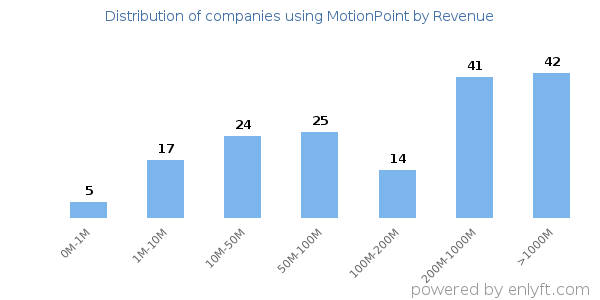 We have data on 199 companies that use MotionPoint. The companies using MotionPoint are most often found in United States and in the Hospital & Health Care industry. MotionPoint is most often used by companies with 1000-5000 employees and >1000M dollars in revenue. Our data for MotionPoint usage goes back as far as 5 years and 2 months.