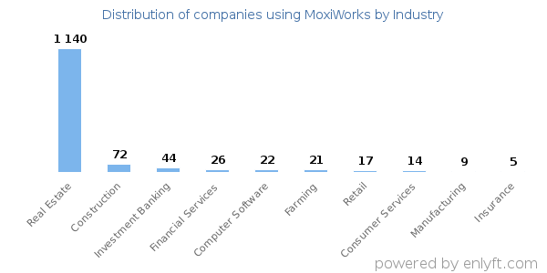We have data on 5,017 companies that use MoxiWorks. The companies using MoxiWorks are most often found in United States and in the Real Estate industry. MoxiWorks is most often used by companies with 1-10 employees and 10M-50M dollars in revenue. Our data for MoxiWorks usage goes back as far as 5 years and 2 months.
