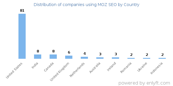 We have data on 134 companies that use MOZ SEO. The companies using MOZ SEO are most often found in United States and in the Marketing and Advertising industry. MOZ SEO is most often used by companies with 10-50 employees and 1M-10M dollars in revenue. Our data for MOZ SEO usage goes back as far as 3 years and 4 months.