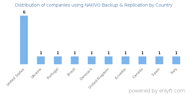 We have data on 15 companies that use NAKIVO Backup & Replication. The companies using NAKIVO Backup & Replication are most often found in United States and in the Information Technology and Services industry. NAKIVO Backup & Replication is most often used by companies with 50-200 employees and 1M-10M dollars in revenue. Our data for NAKIVO Backup & Replication usage goes back as far as 8 years and 5 months.