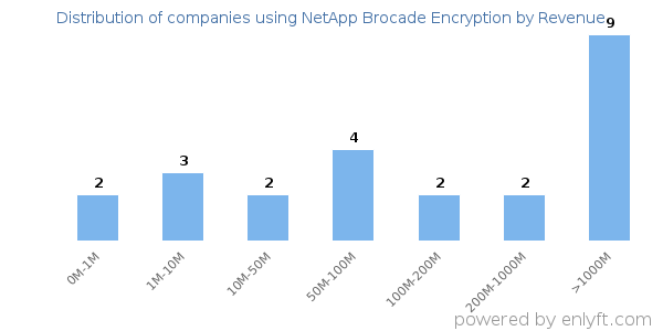 Of all the customers that are using NetApp Brocade Encryption, 9% are small (<$50M), 13% are medium-sized and 34% are large (>$1000M).