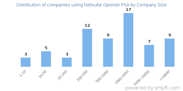Of all the customers that are using Netsuite OpenAir PSA, 9% are small (<50 employees), 32% are medium-sized and 46% are large (>1000 employees).