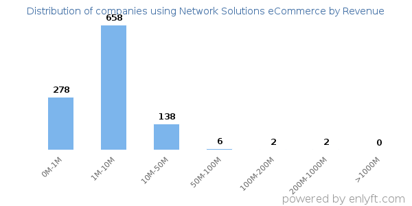 Of all the customers that are using Network Solutions eCommerce, a majority (89%) are small (<$50M), 0% are large (>$1000M) and 0% are medium-sized.