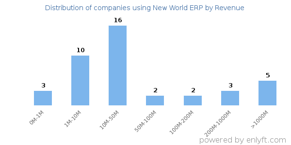Of all the customers that are using New World ERP, a majority (64%) are small (<$50M), 15% are large (>$1000M) and 0% are medium-sized.