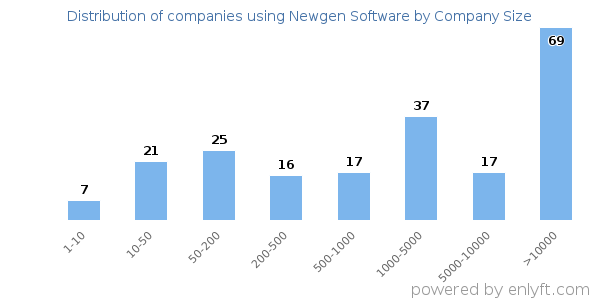 Of all the customers that are using Newgen Software, a majority (56%) are large (>$1000M), 25% are small (<$50M) and 12% are medium-sized.