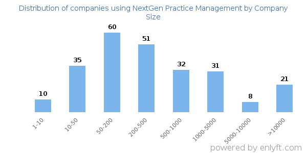 We have data on 250 companies that use NextGen Practice Management. The companies using NextGen Practice Management are most often found in United States and in the Hospital & Health Care industry. NextGen Practice Management is most often used by companies with 50-200 employees and 10M-50M dollars in revenue. Our data for NextGen Practice Management usage goes back as far as 8 years and 2 months.