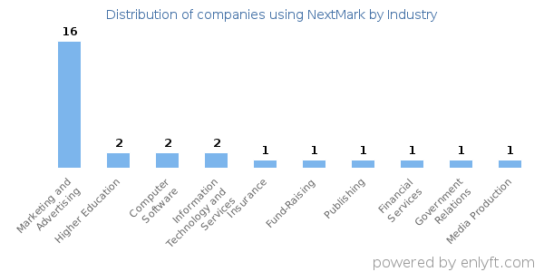 We have data on 30 companies that use NextMark. The companies using NextMark are most often found in United States and in the Marketing and Advertising industry. NextMark is most often used by companies with 50-200 employees and 1M-10M dollars in revenue. Our data for NextMark usage goes back as far as 8 years and 5 months.